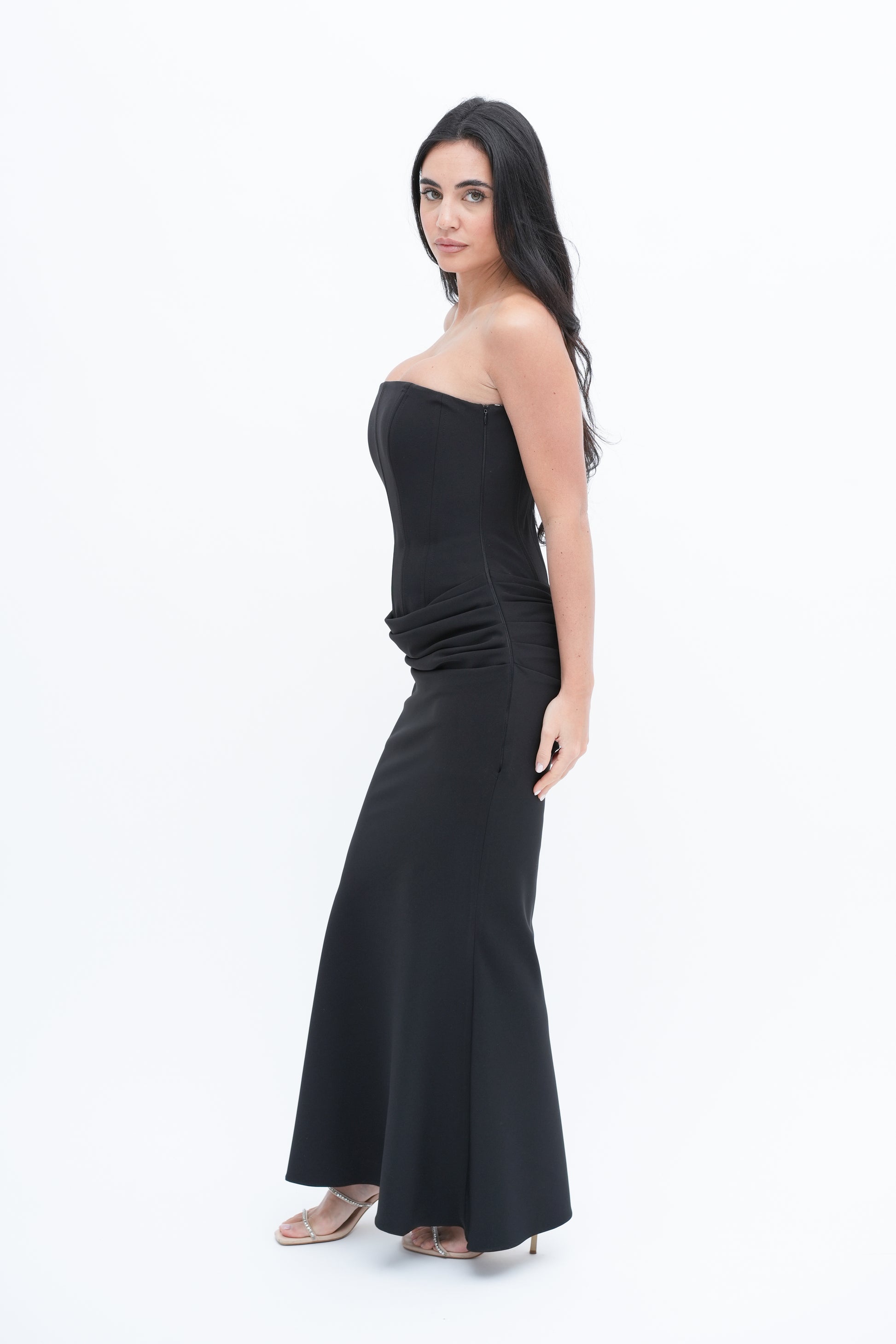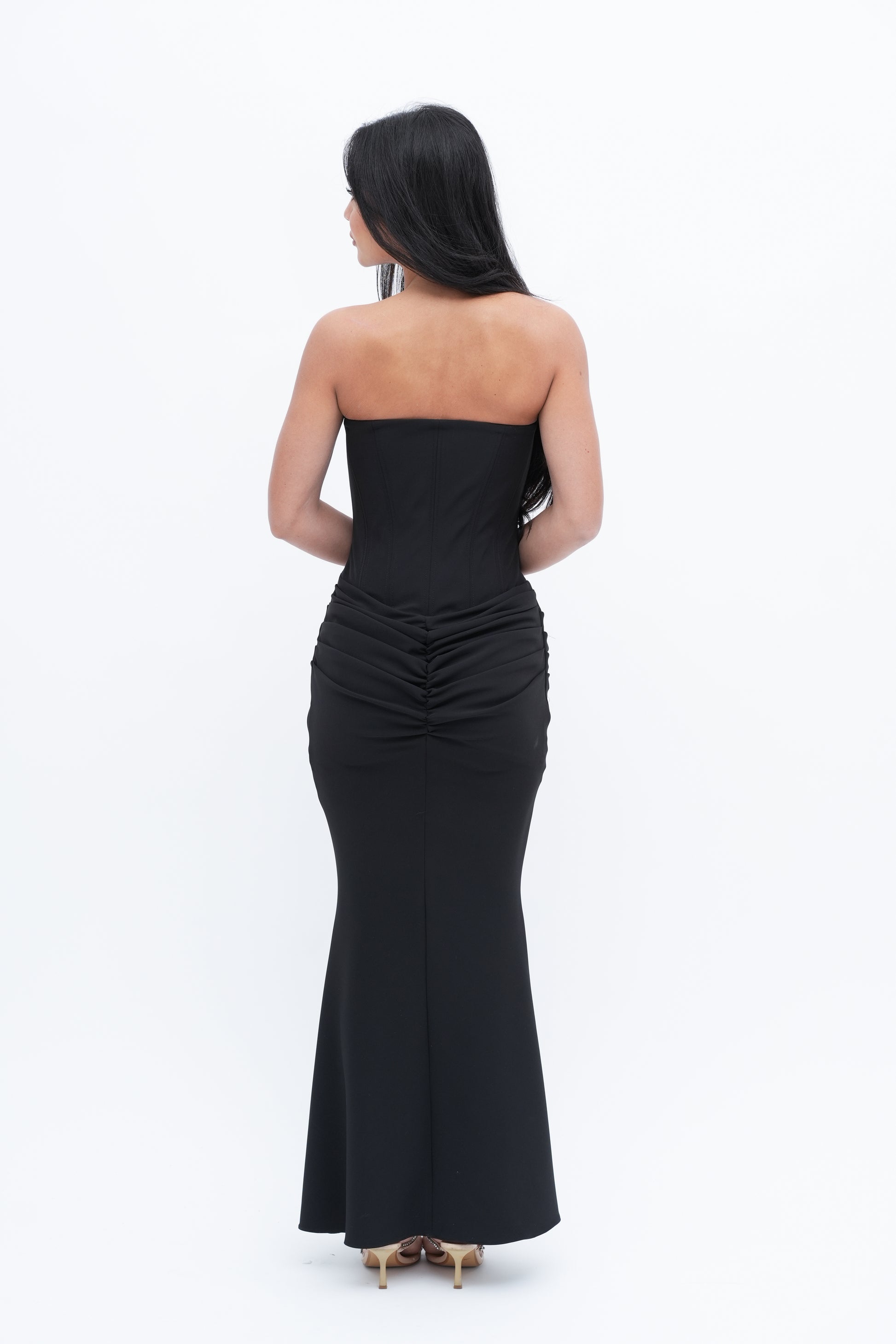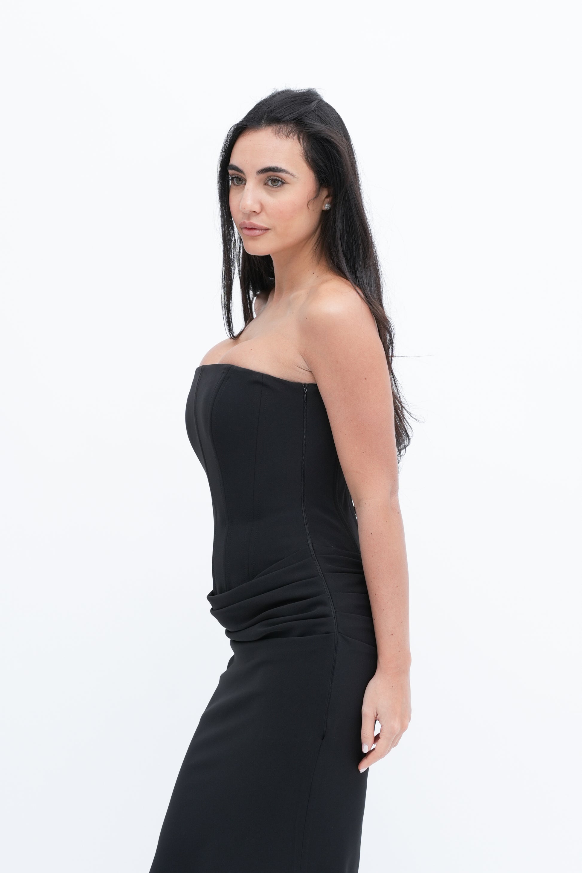 Questo abito longuette, caratterizzato da un corsetto steccato, è l'espressione perfetta di eleganza strutturata e sensualità. Il corsetto steccato offre un supporto impeccabile, modellando il corpo e accentuando la vita con una vestibilità definita e sofisticata. La struttura rigida del corsetto, combinata con il design senza spalline, esalta la silhouette, creando una figura snodabile ed elegante, mentre le stecche garantiscono un comfort e una vestibilità ottimali.