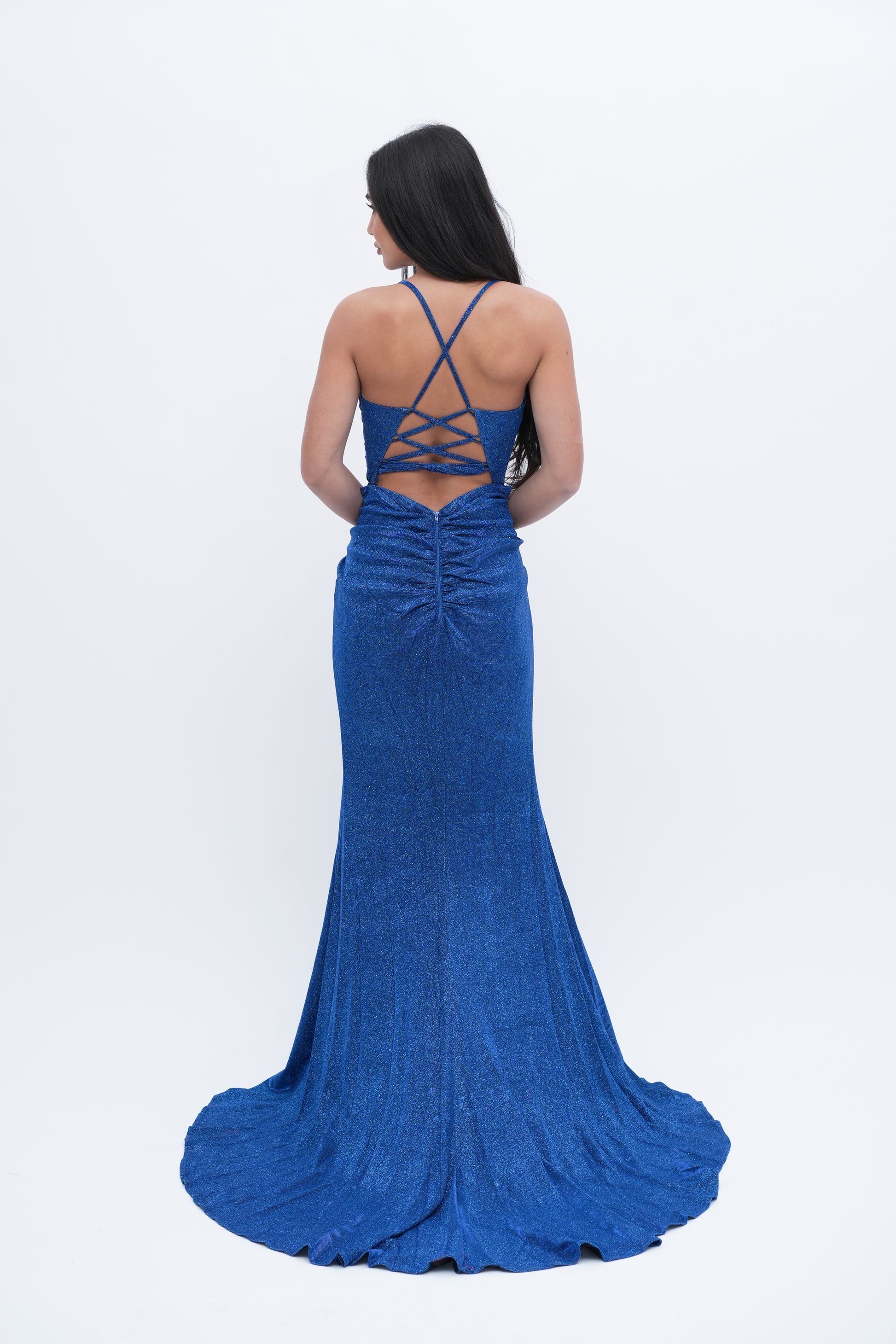 La parte posteriore dell'abito è caratterizzata da una scollatura profonda, arricchita da laccetti che si intrecciano elegantemente, permettendo di regolare la vestibilità e aggiungendo un tocco di sensualità. Questa scollatura, combinata con la brillantezza del glitter, dona un effetto di grande impatto visivo, senza mai risultare troppo audace.
