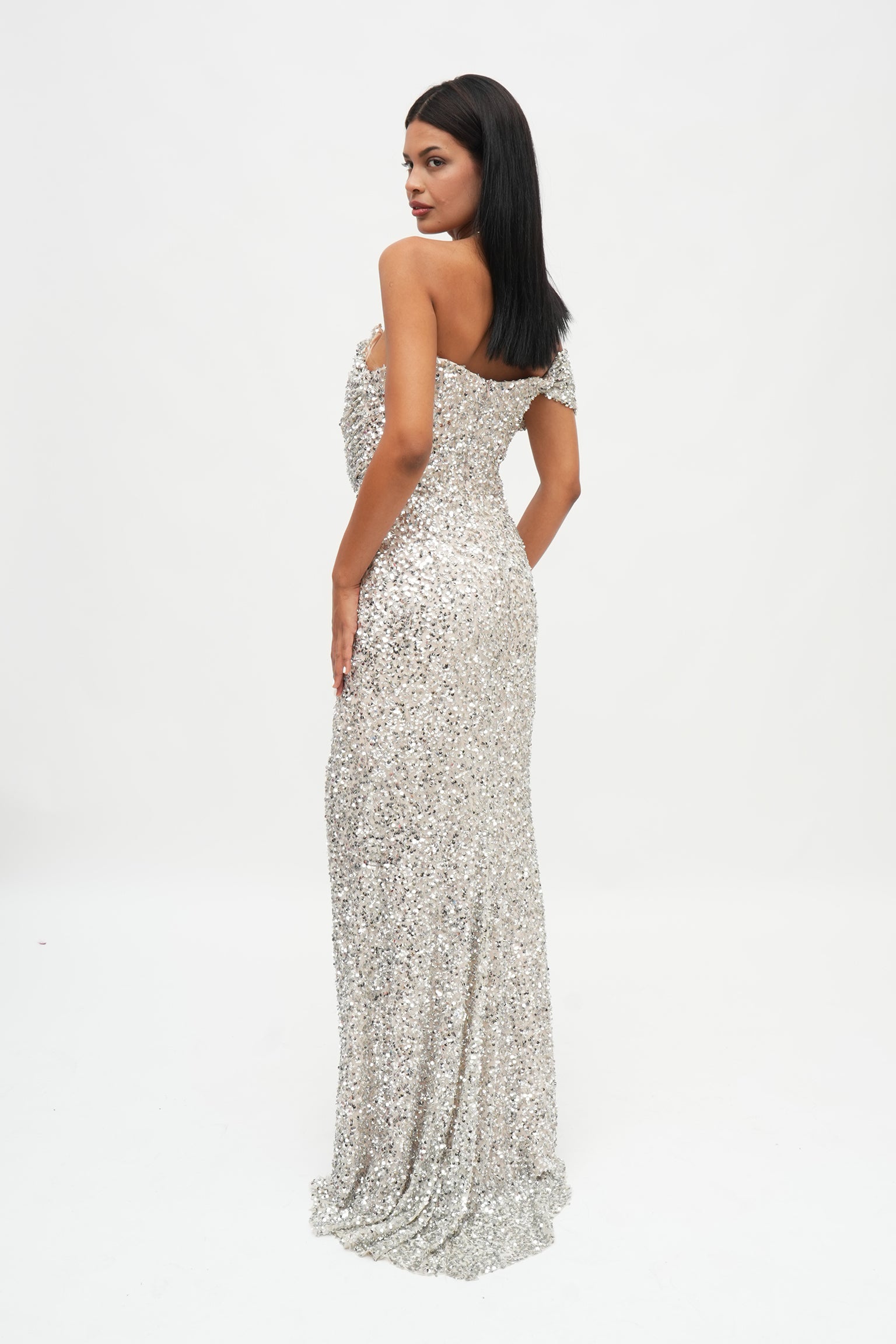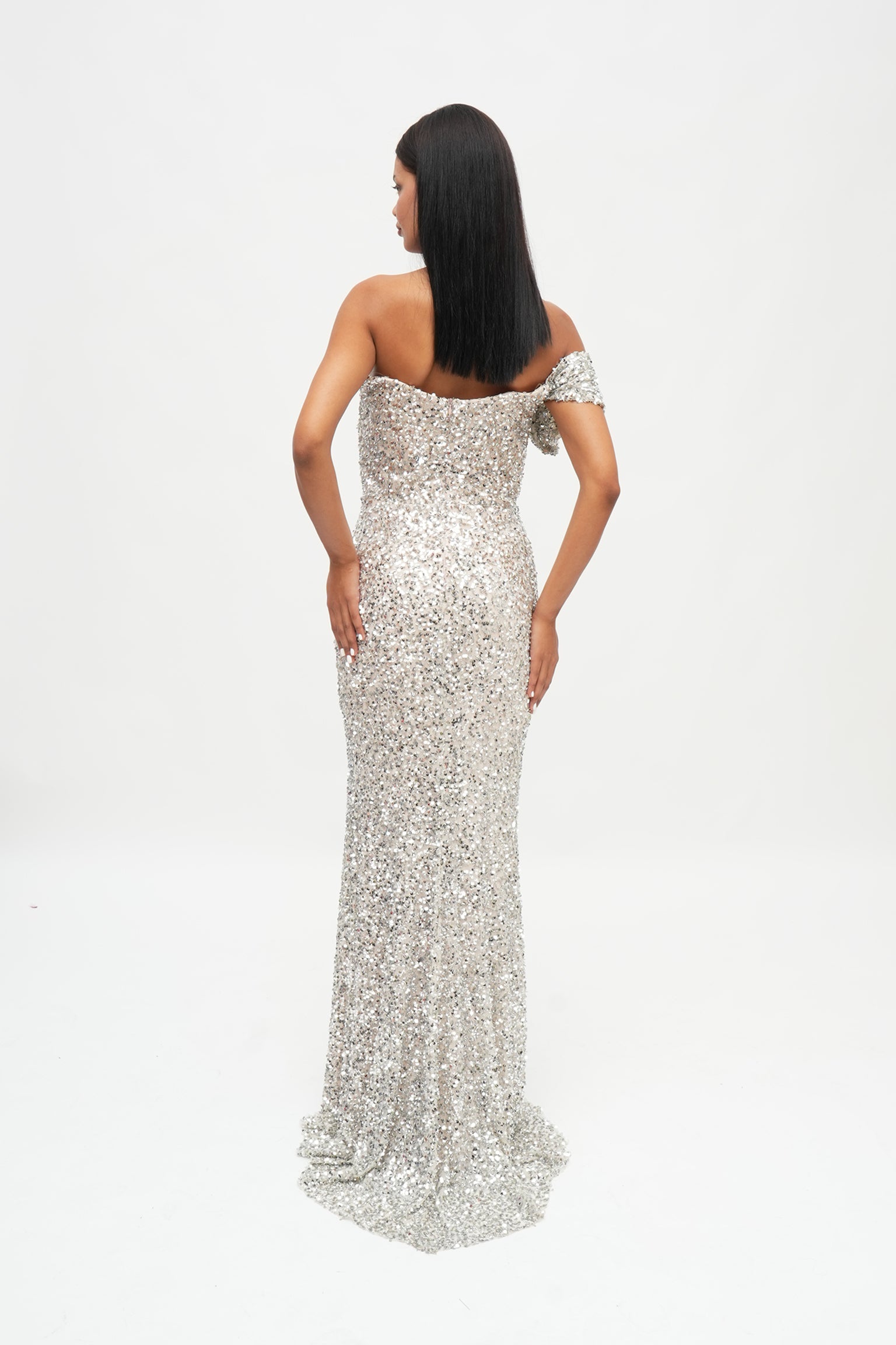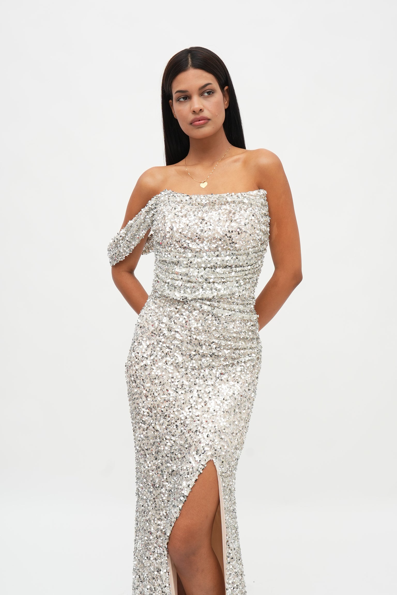 Brilla in ogni occasione con questo elegante abito da sera lungo interamente ricoperto di paillettes argentate. Il design monospalla con dettaglio drappeggiato dona un tocco sofisticato e moderno, mentre lo spacco laterale sulla gonna aggiunge sensualità e movimento. La vestibilità aderente esalta la silhouette, perfetta per eventi glamour, cerimonie e serate speciali.