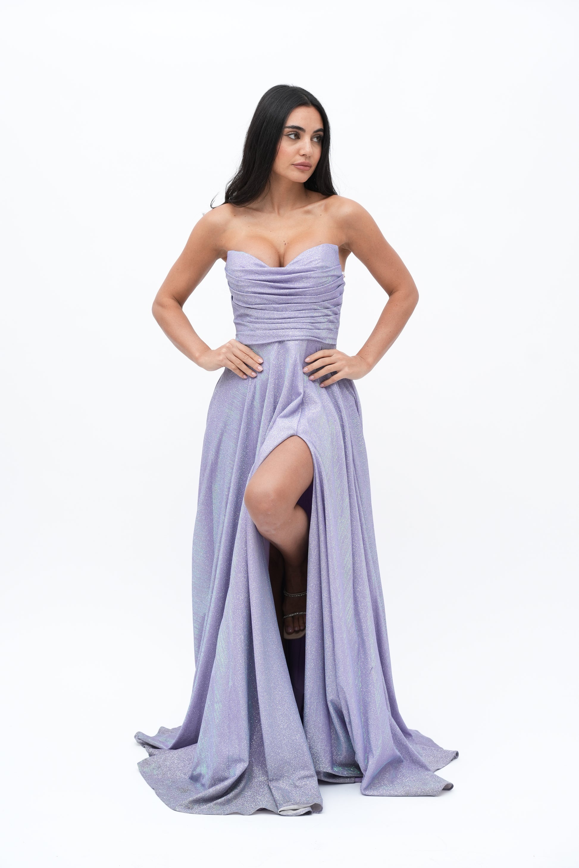 Questo abito lilla, elegante e sofisticato, unisce delicatezza e luminosità grazie alla trama di lurex argento che impreziosisce il tessuto. Il lurex dona al vestito una finitura scintillante che cattura la luce, creando un effetto raffinato e leggermente metallizzato, perfetto per un'occasione speciale. Il colore lilla, morbido e femminile, si abbina perfettamente al brillantezza dell'argento, aggiungendo un tocco di eleganza senza essere eccessivo.