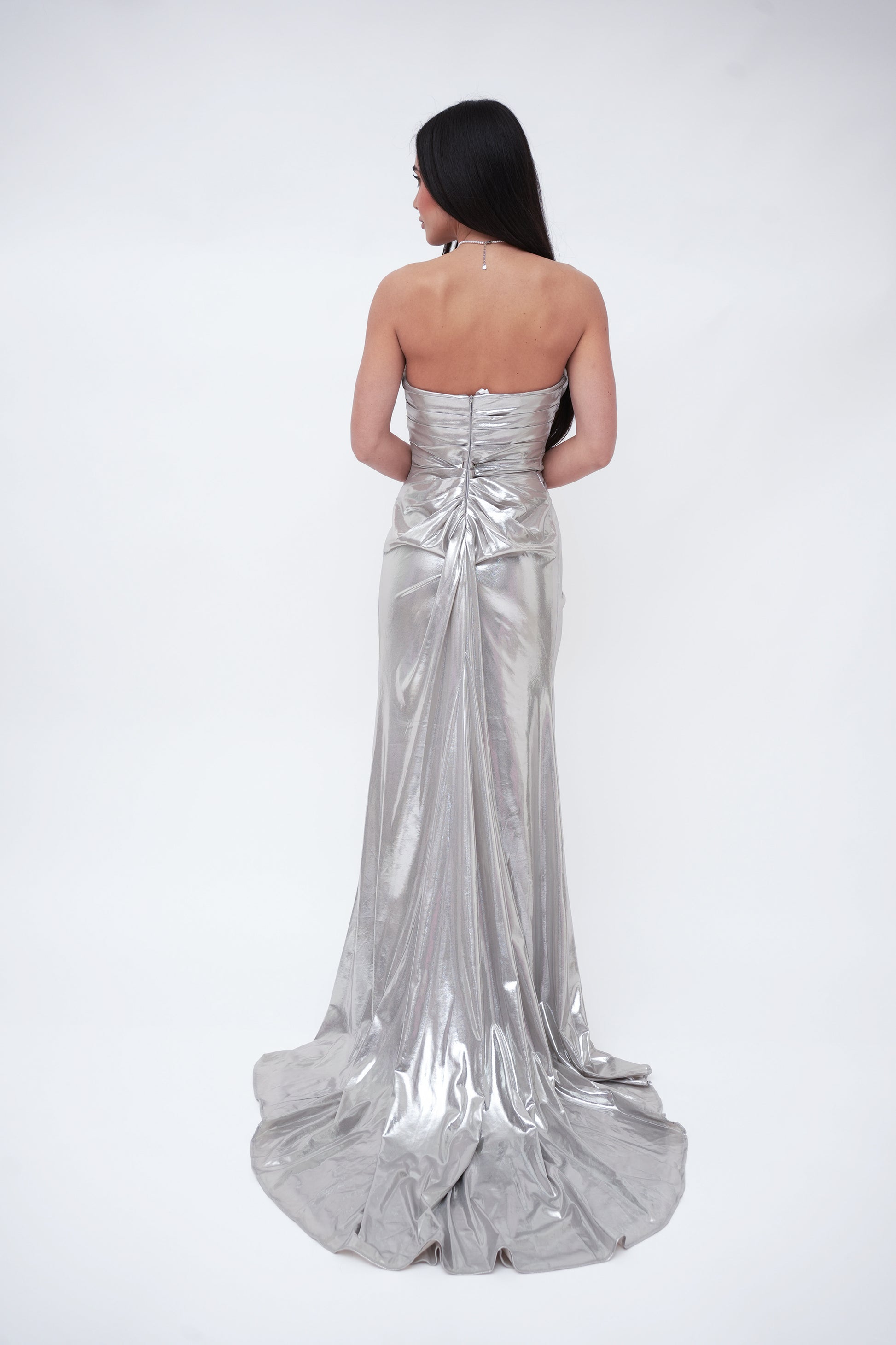 “Silver Goddess – Abito da Sera Laminato con Dettagli Brillanti”
