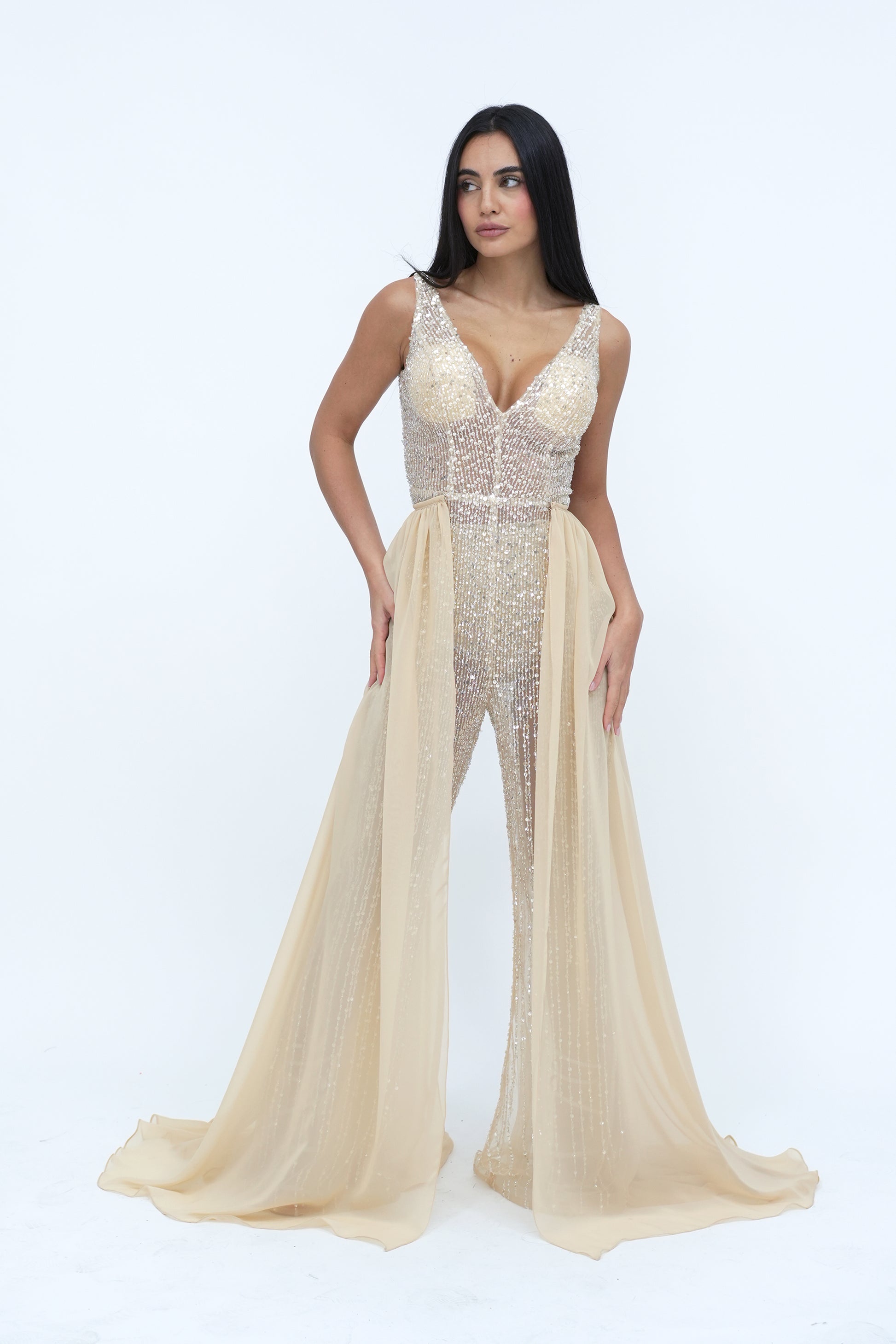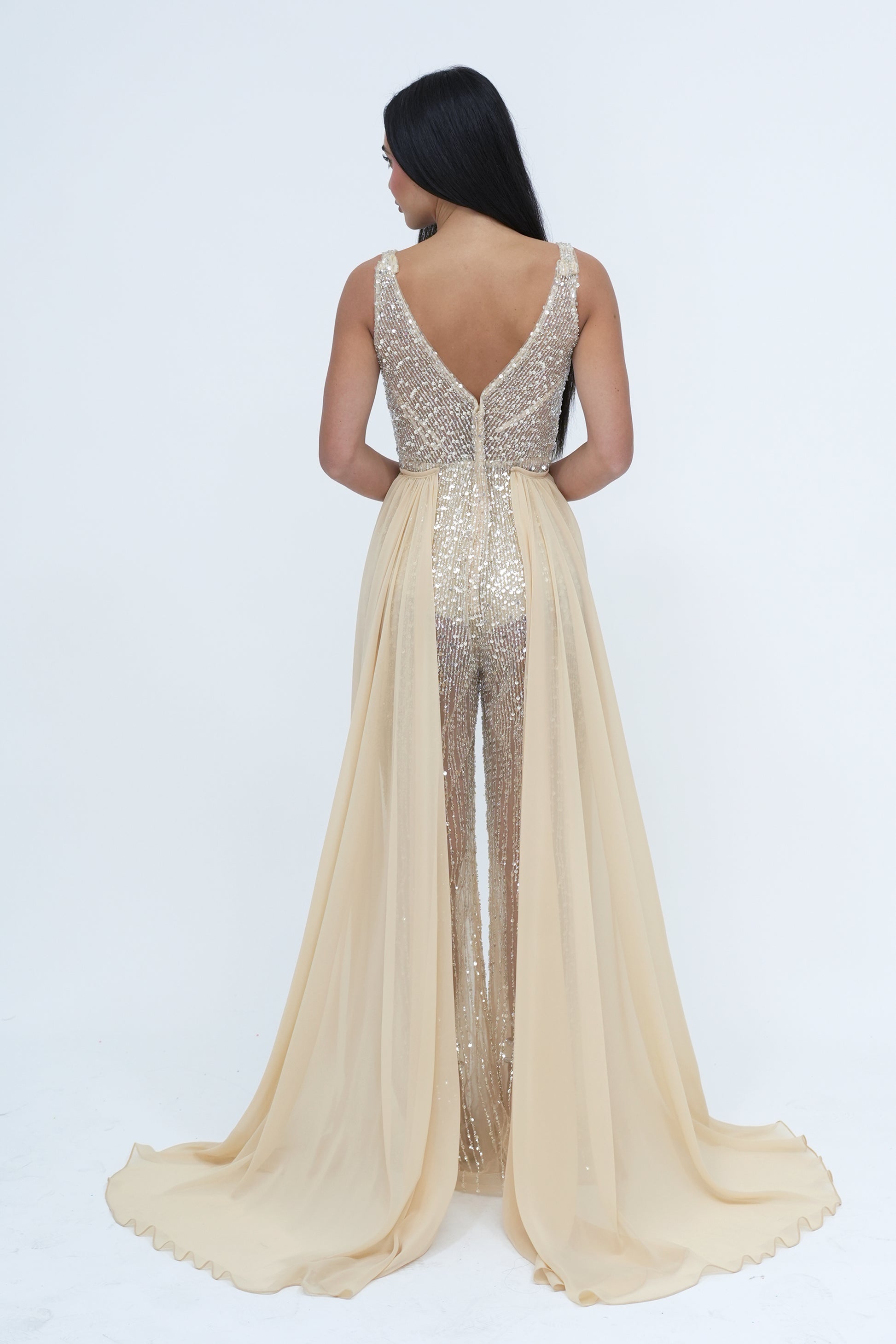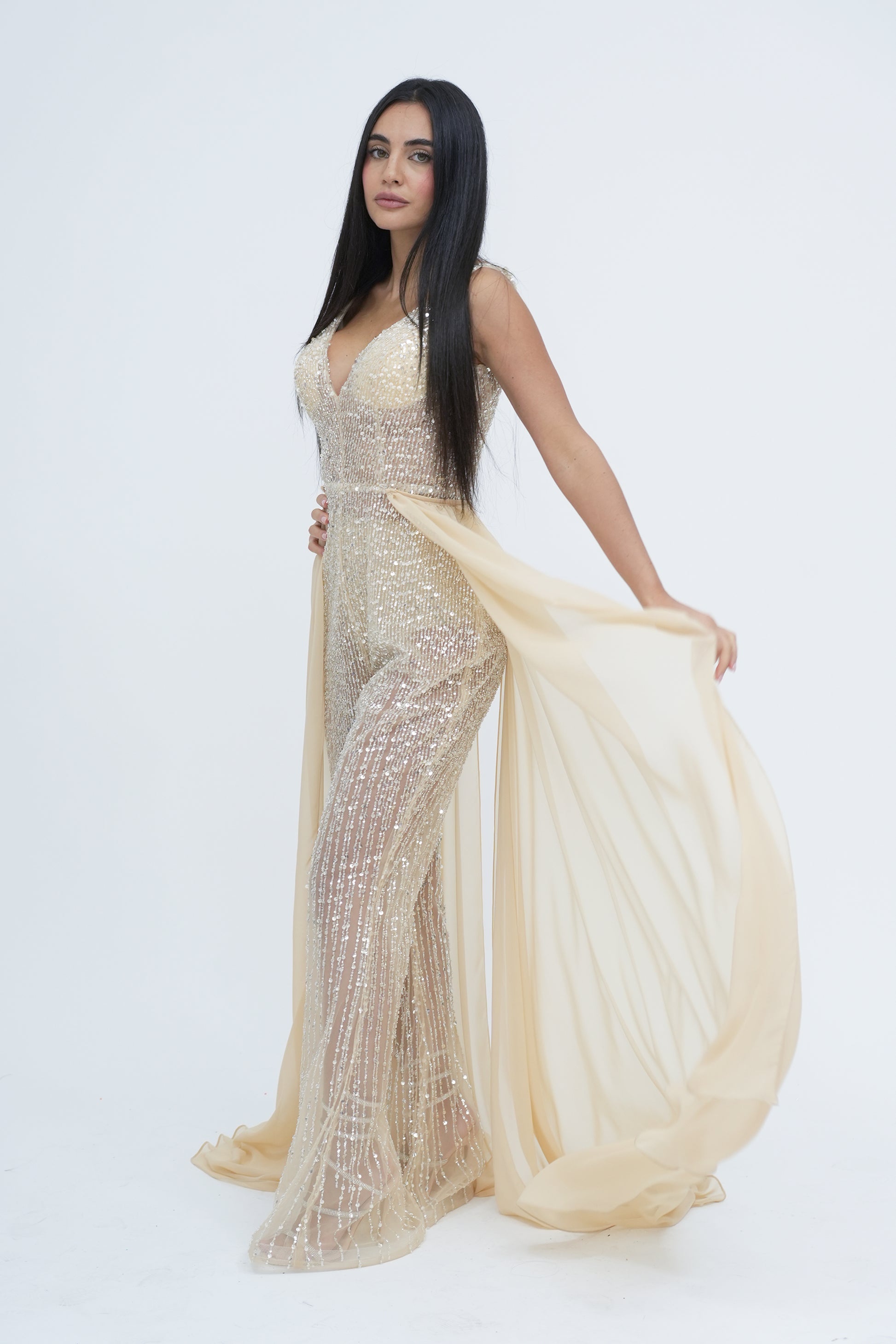 Tuta elegante “Golden Glow” con dettagli scintillanti e pannelli in chiffon