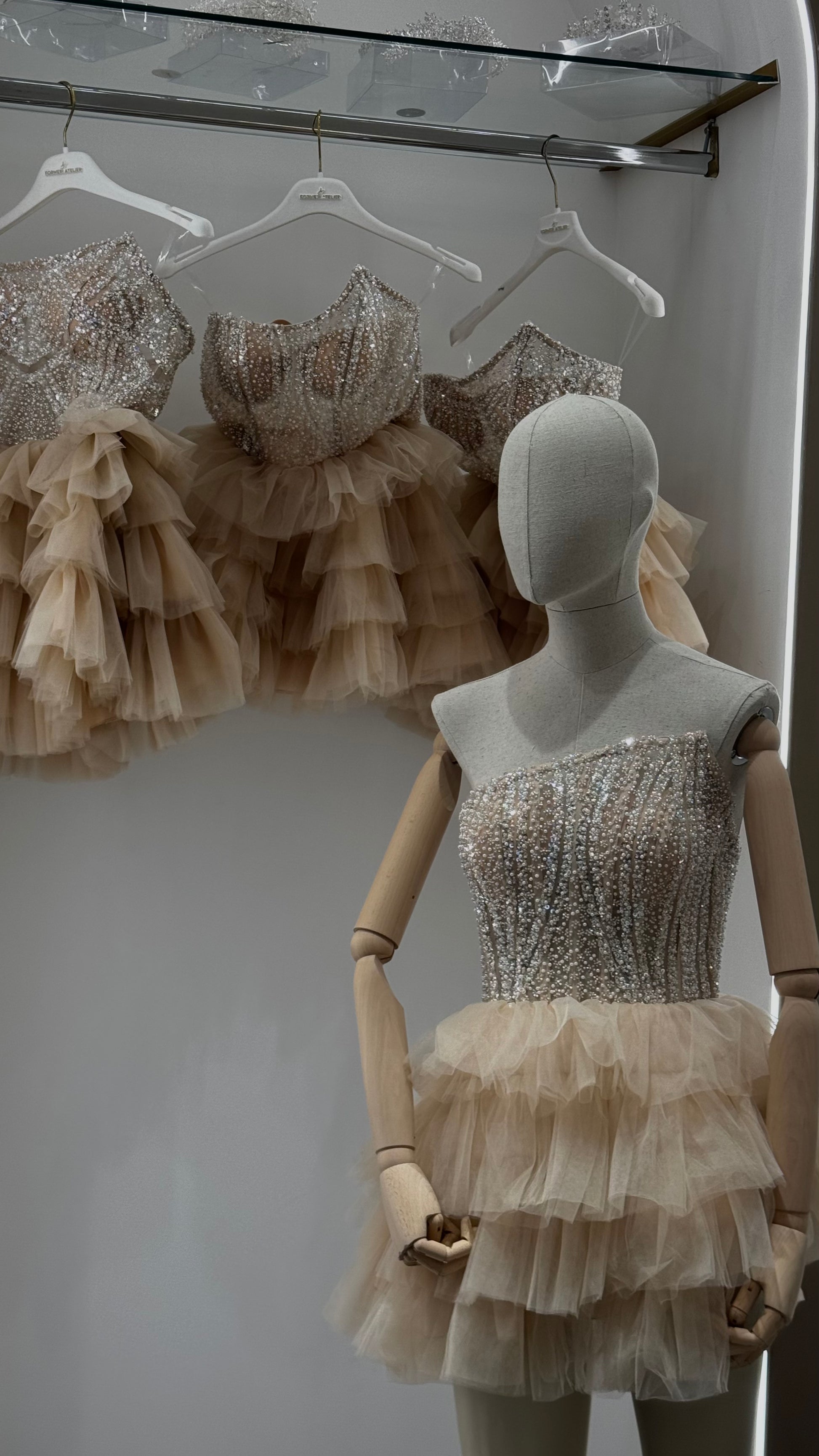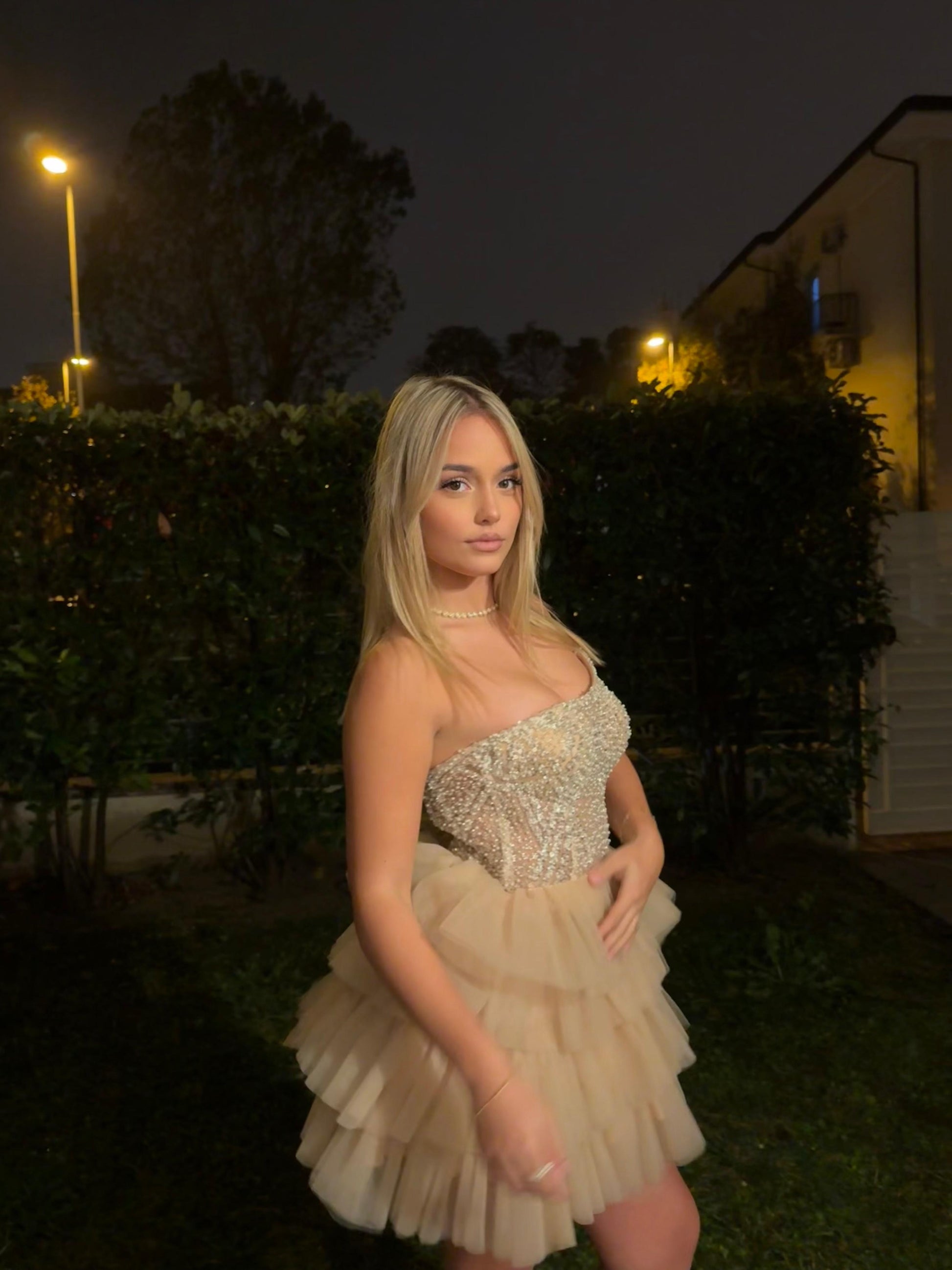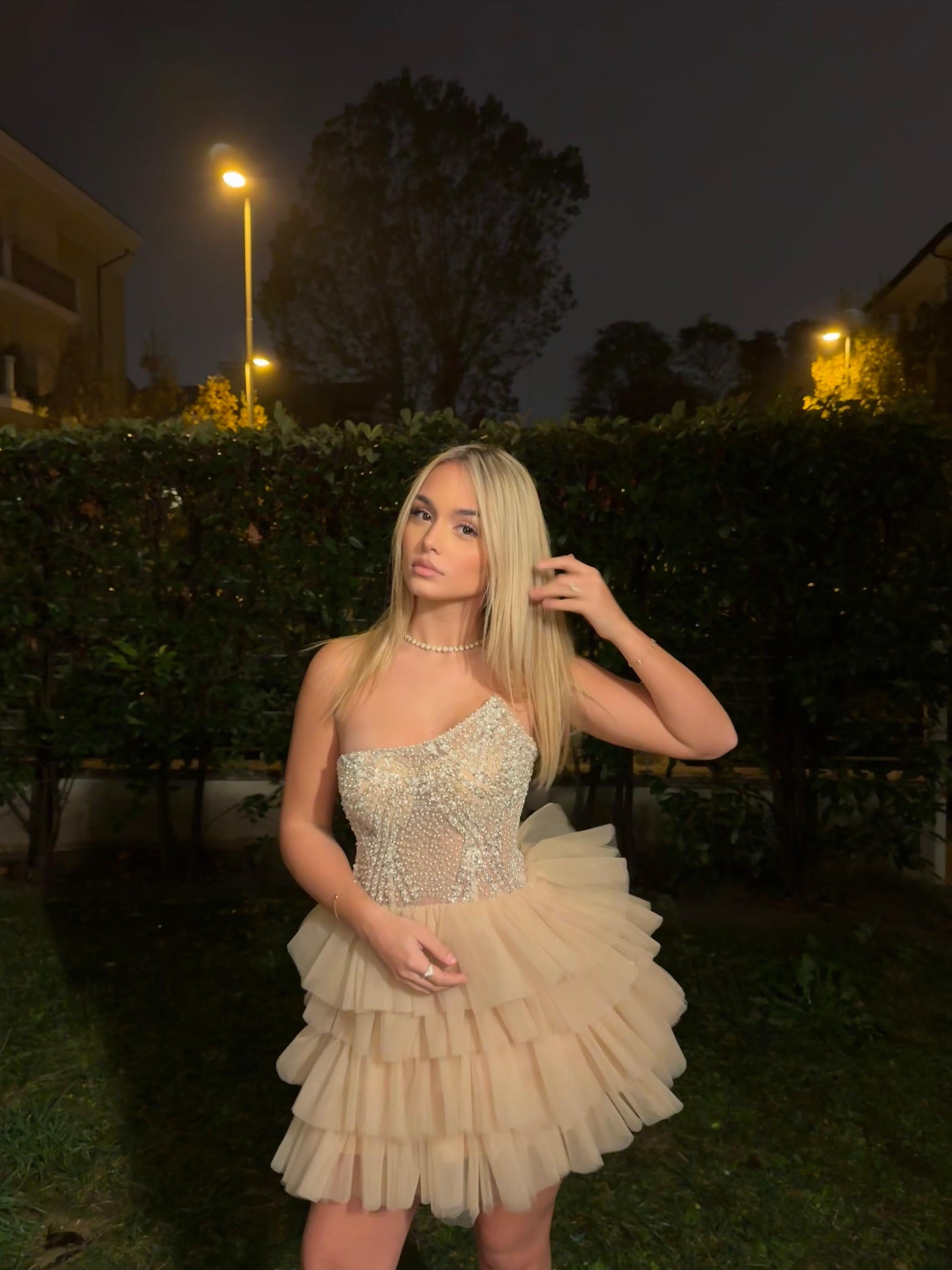 Il corpetto scintillante, interamente ricamato con microcristalli, valorizza la silhouette con eleganza, mentre la gonna corta in tulle a balze dona movimento e leggerezza.