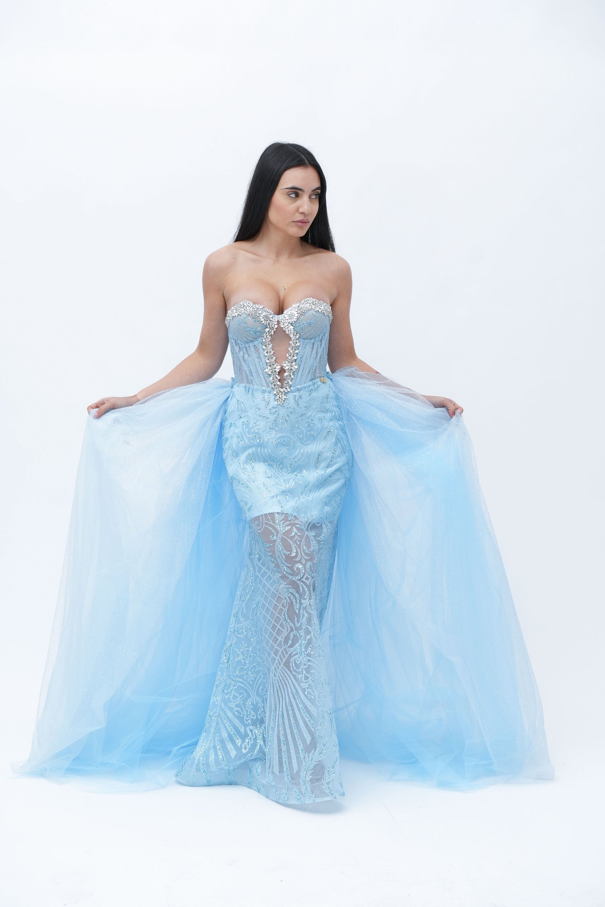 Sopra il corpo aderente, l'abito è arricchito da una gonna in tulle che si distende con grazia, aggiungendo un contrasto visivo e un movimento fluido al look. Il tulle, leggero e vaporoso, dona volume alla parte inferiore dell'abito, creando un effetto di drappeggio che si muove elegantemente ad ogni passo. La combinazione della parte superiore semi-trasparente con la gonna di tulle dona un aspetto etereo e romantico, perfetto per serate speciali, eventi formali o occasioni in cui si desidera un look che unisca delicatezza e audacia.