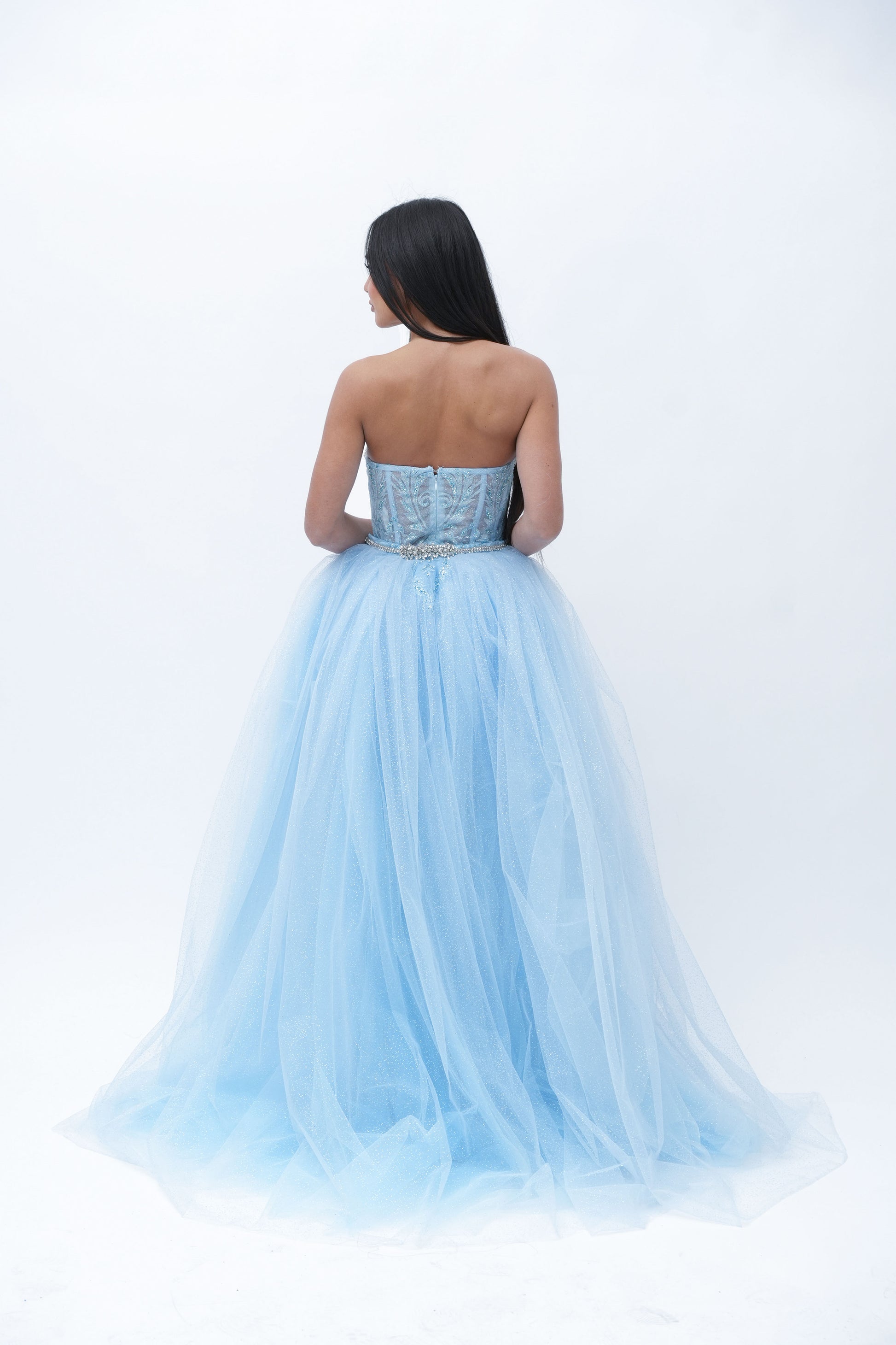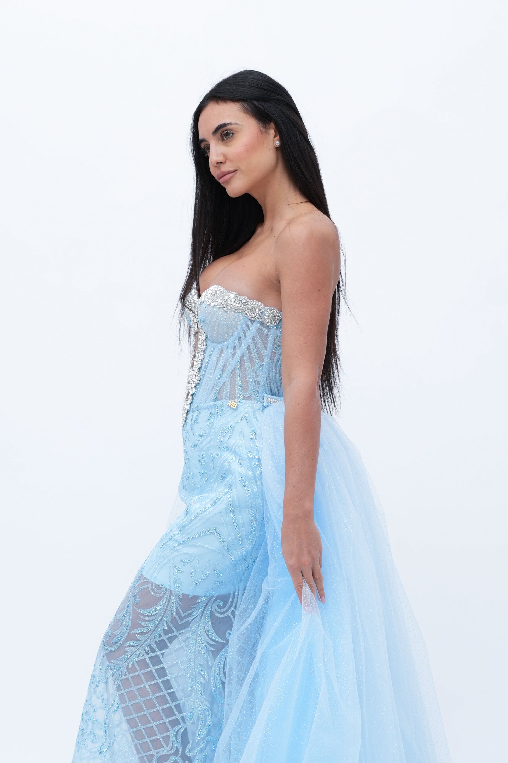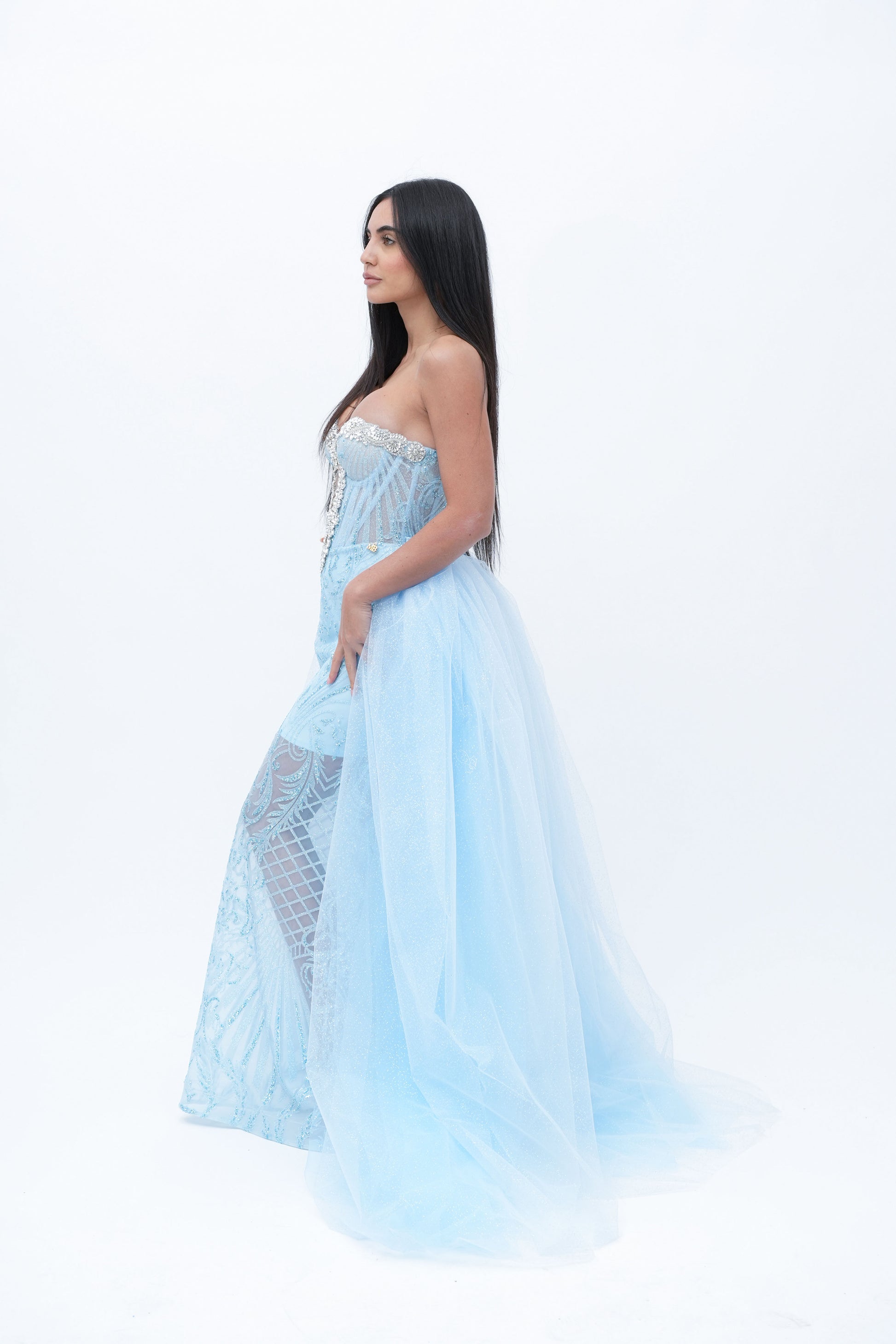 Questo abito è un perfetto equilibrio tra sensualità e grazia, ideale per chi cerca un look raffinato e al tempo stesso audace. Il corpino dell'abito è stretto a cuore, con una forma che esalta delicatamente il décolleté, creando una silhouette affusolata e femminile. Il design semi-trasparente del tessuto aggiunge un tocco di mistero e sensualità, lasciando intravedere la pelle con eleganza senza rivelare troppo. La leggerezza e la delicatezza del materiale creano un effetto visivo sofisticato, accentuando la figura in modo armonioso.