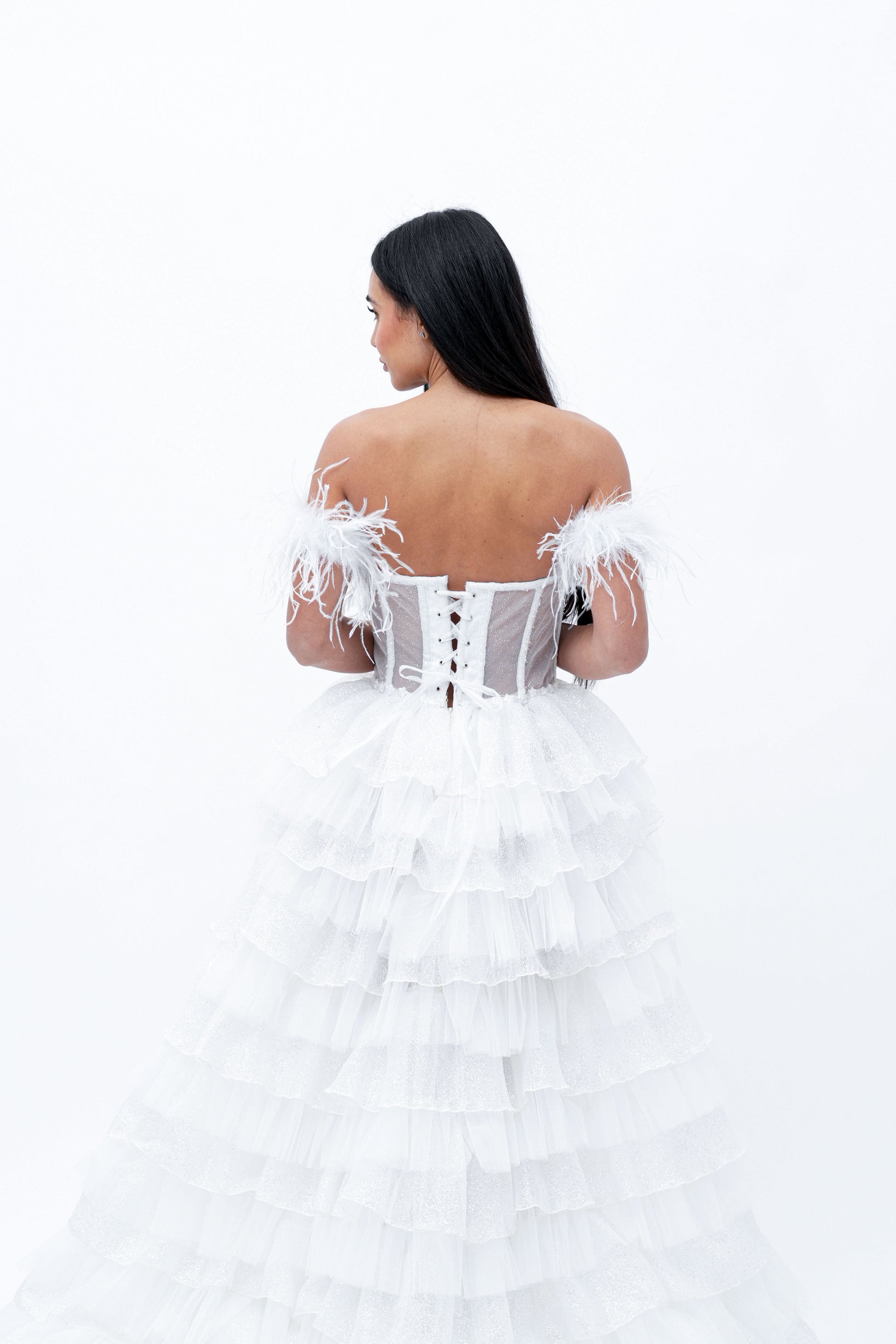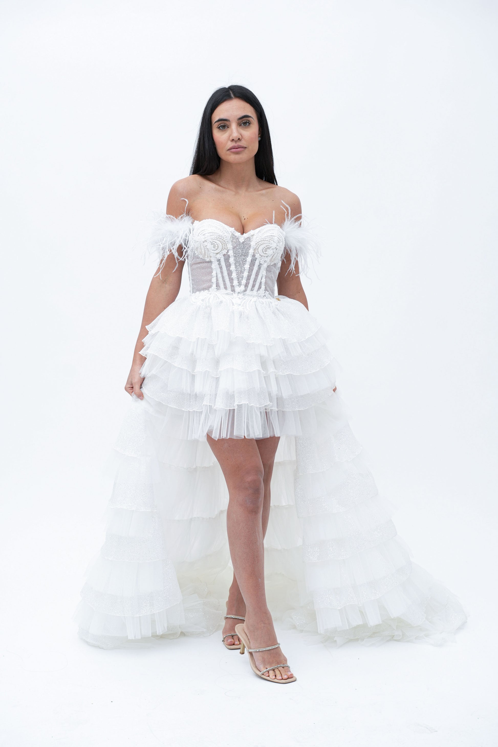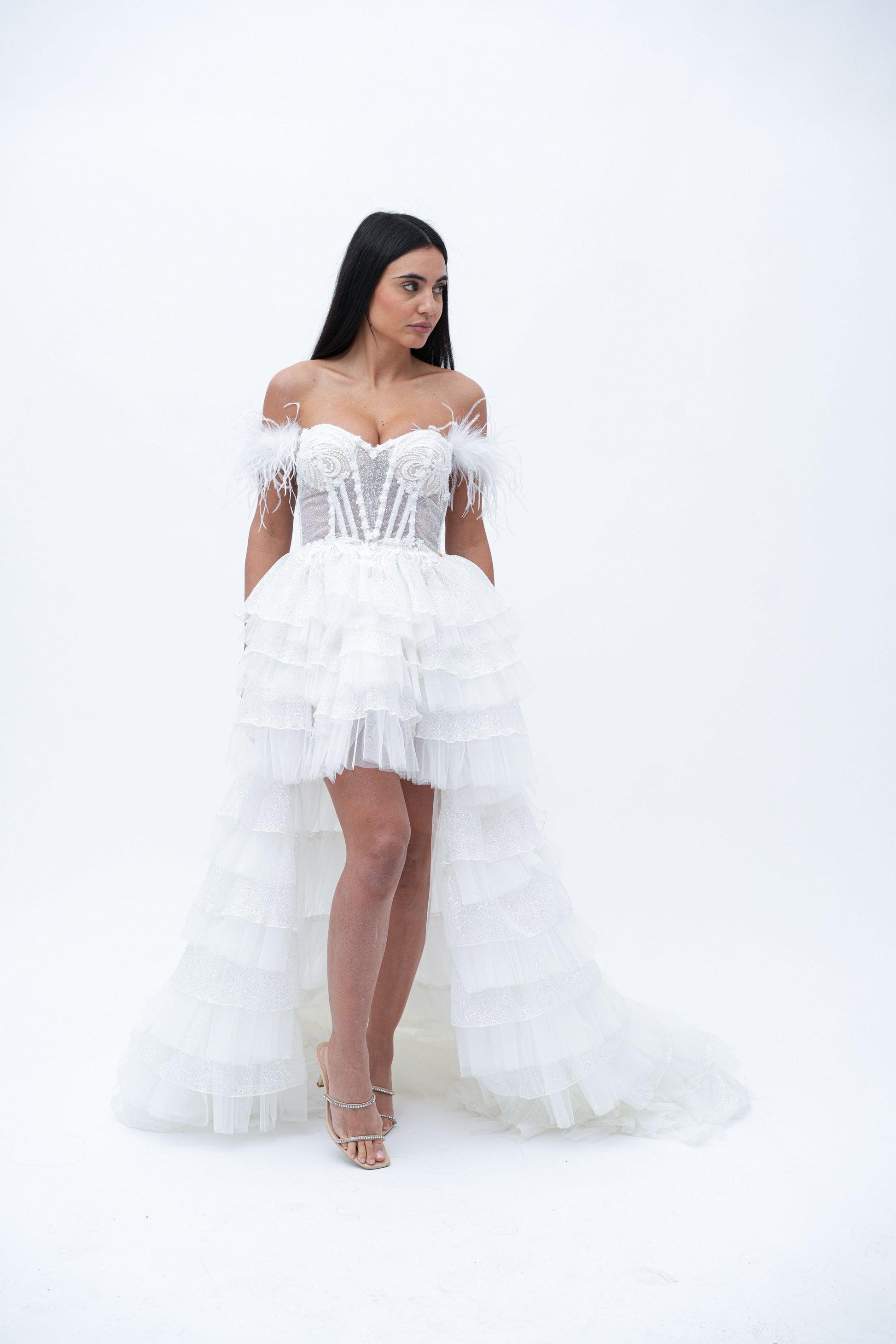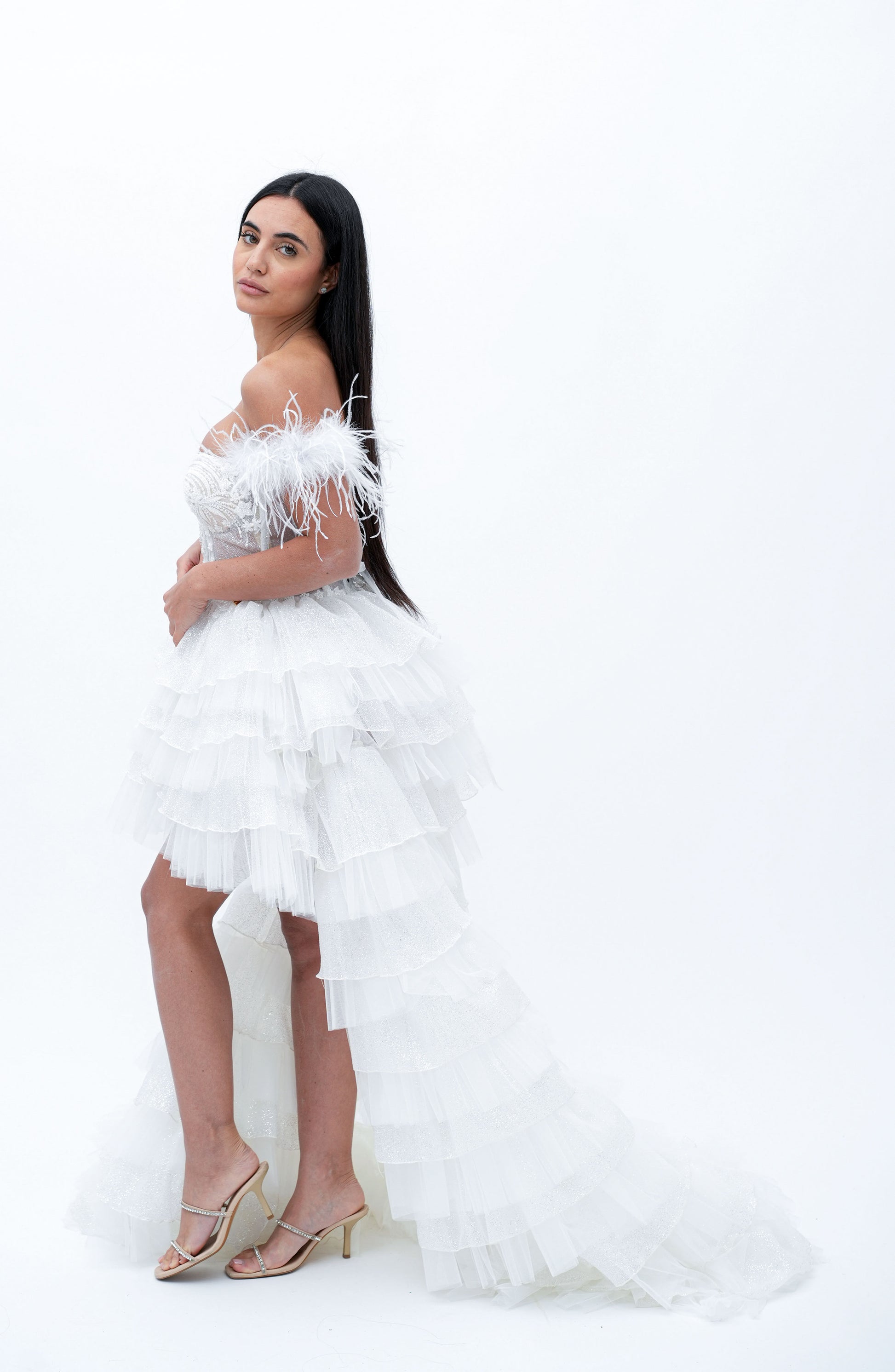 La gonna, un capolavoro di leggerezza, è realizzata in tulle a balze glitterate, che cattura la luce e riflette una brillantezza magica. Il design corto davanti e lungo dietro crea un contrasto dinamico e moderno, con la parte anteriore che lascia scoprire le gambe in modo delicato, mentre la parte posteriore si allunga in una coda morbida che conferisce all'abito un'aria da red carpet. Il tulle a balze, disposto in modo strategico, aggiunge volume e movimento, donando all'abito un effetto vaporoso e un senso di fluidità, mentre il glitter arricchisce il tutto con un tocco scintillante che non passa inosservato.