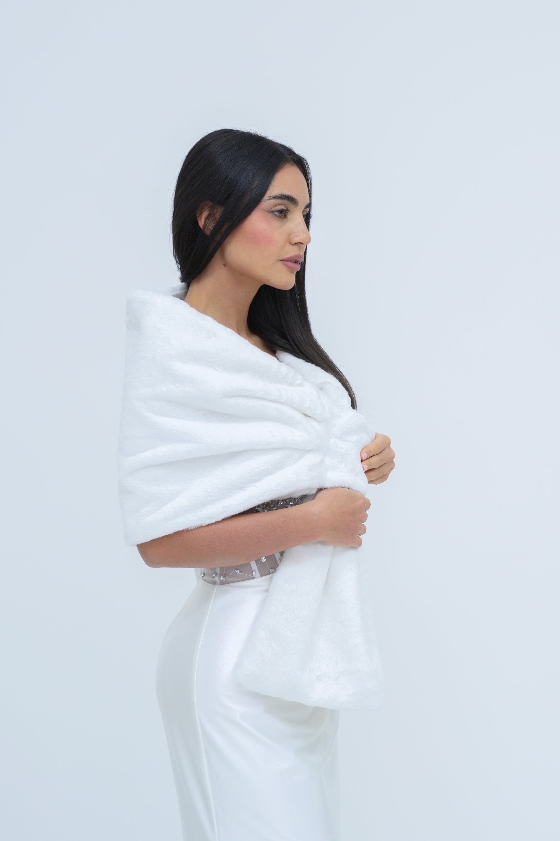 Una stola raffinata ed elegante, realizzata in soffice pelliccia ecologica bianca che avvolge delicatamente le spalle, emanando un senso di calore e lusso. Il bianco puro del materiale cattura la luce, donando un effetto luminoso e setoso, perfetto per completare un outfit da sera o cerimonia.
