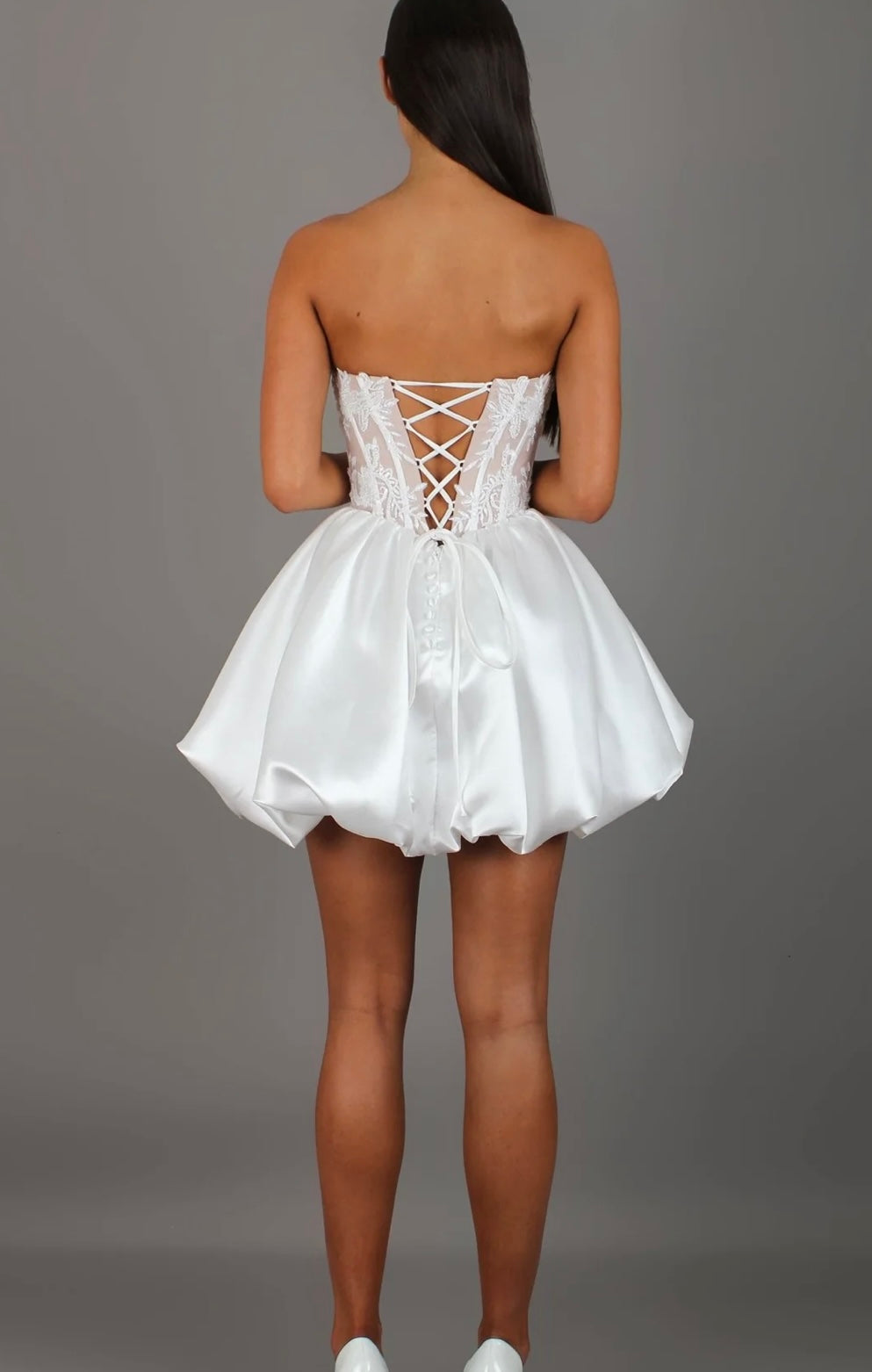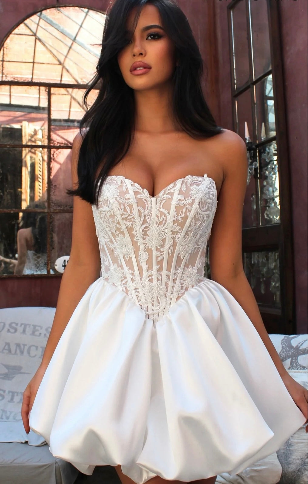 - Stile generale: l’abito unisce elementi da bridal moderno o da cerimonia a un tocco giovanile grazie alla lunghezza corta. Potrebbe essere perfetto per un matrimonio civile, un party elegante o un evento estivo.