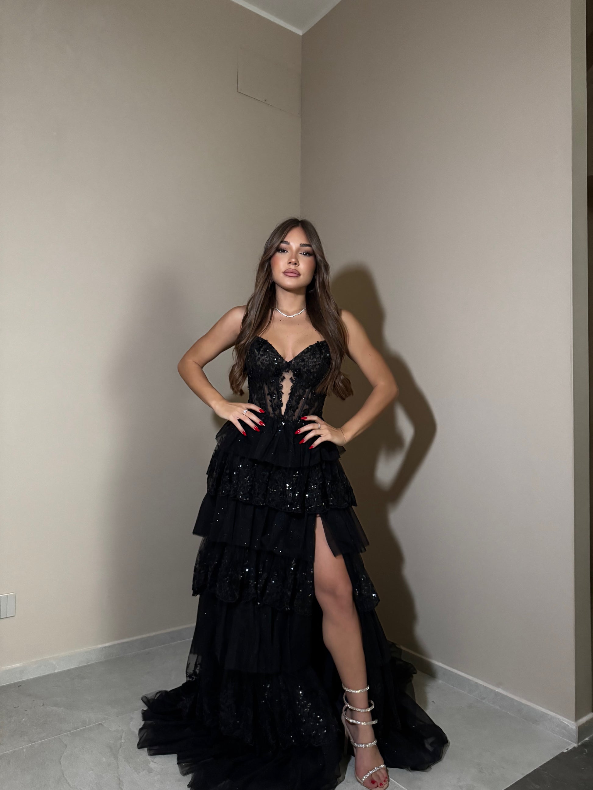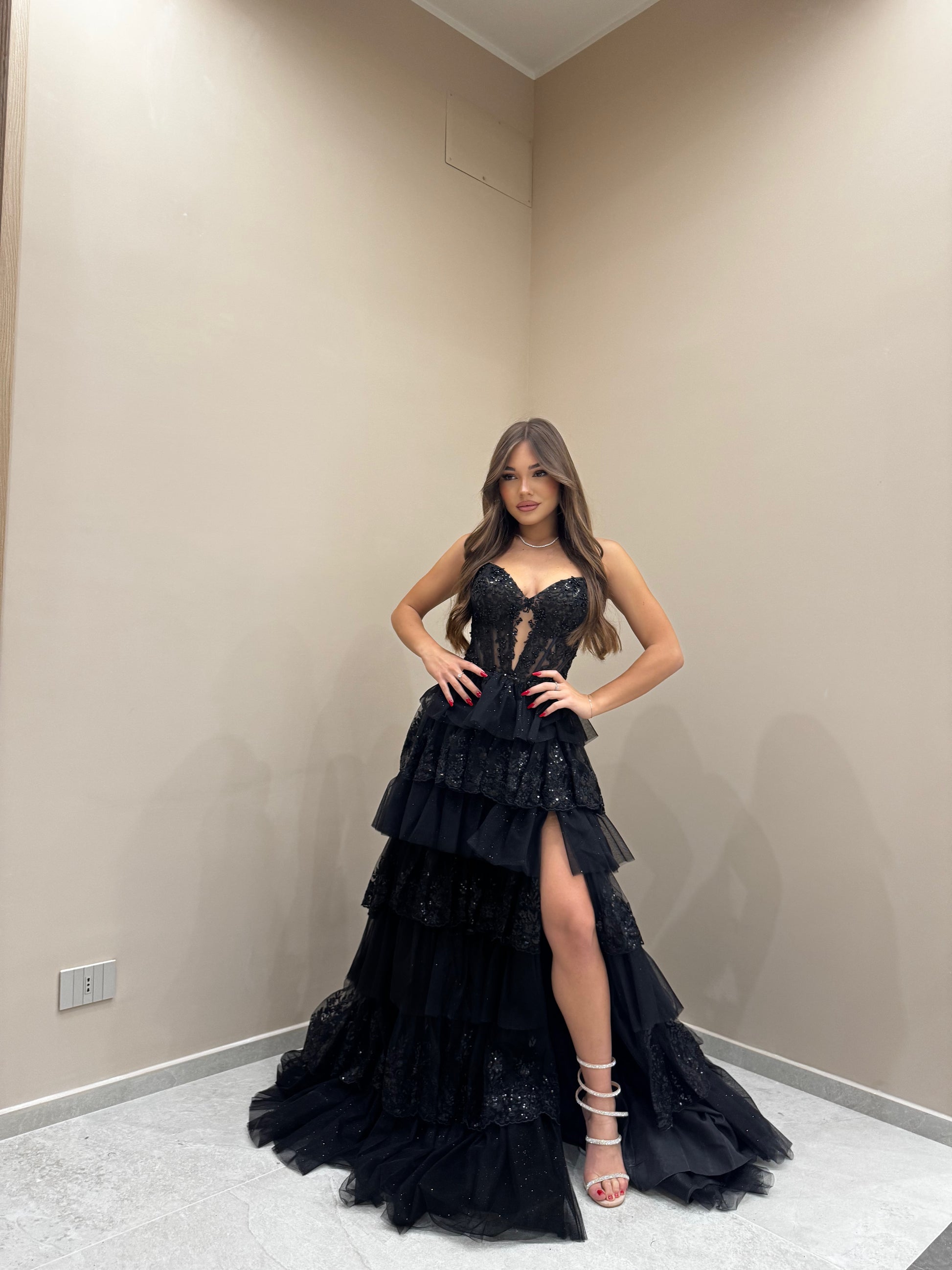 - Corpetto: Aderente, con scollo a cuore e dettagli in pizzo trasparente che creano un effetto vedo-non-vedo sofisticato. Le decorazioni in paillettes o micro glitter aggiungono luminosità al busto.